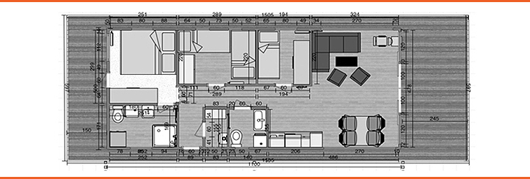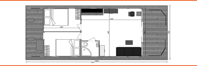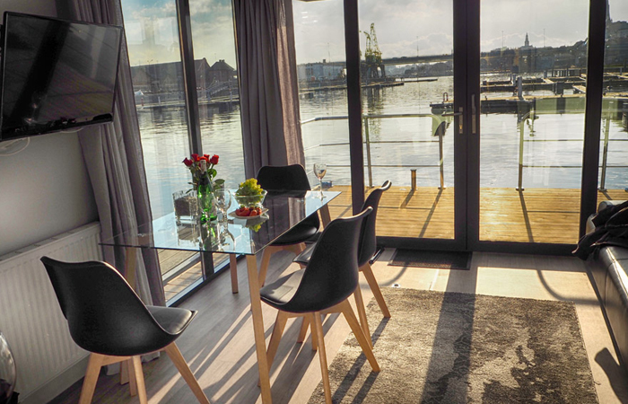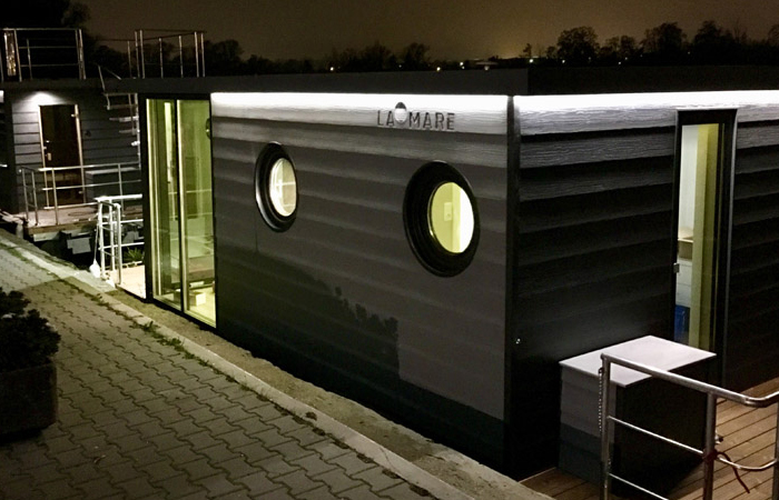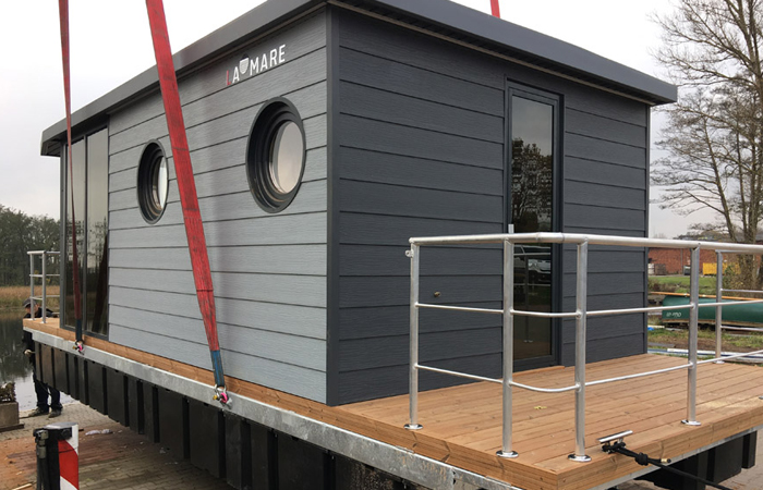 Enhet med en bredde på 6 m, lengde 15 m, total høyde 3,40 m, høyde over vannnivå 2,90-3,00 m avhengig av lasten, dypping om 0,3-0,45m, polyetylen flyter, trimaran. Boareal 11x5,5 m = 60,5 m2, bue terrasse 12 m2, akter terrasse 8 m2. Enheten er beregnet til svømming på elver, kanaler, innsjøer og på kystvann. Muligheten for bruk om vinteren.