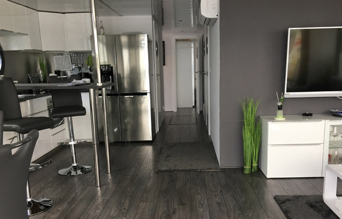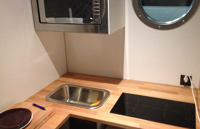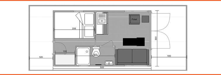 - Kjøkkenkrok: kjøkkenmøbler, lengde 120 cm (opp og ned), belysning, 2-brenner gass komfyr, innebygd kjøleskap 230V