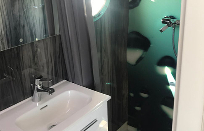 - Baderom: dusj, elektrisk toalett, speil, servant med skap