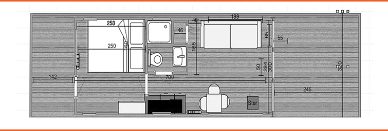 Lengde 9 m, bredde 3 m, høyde (i dette flyter) 3,40 m, høyde over nivå vann 2,70 – 2,90 avhengig av lasten, boareal 5mx3m = 15m2, nedsenking 0,40-0,50 m, kategori D, CE